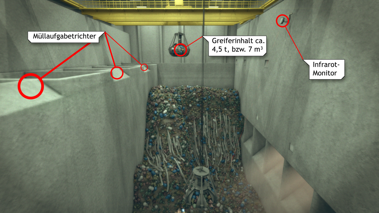 Nach einer 360°-Kamerafahrt rund um die Anlage werden einzelne Stationen wie Müllbunker, Feuerung, Katalysator und Kamin dargestellt.