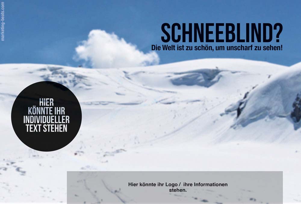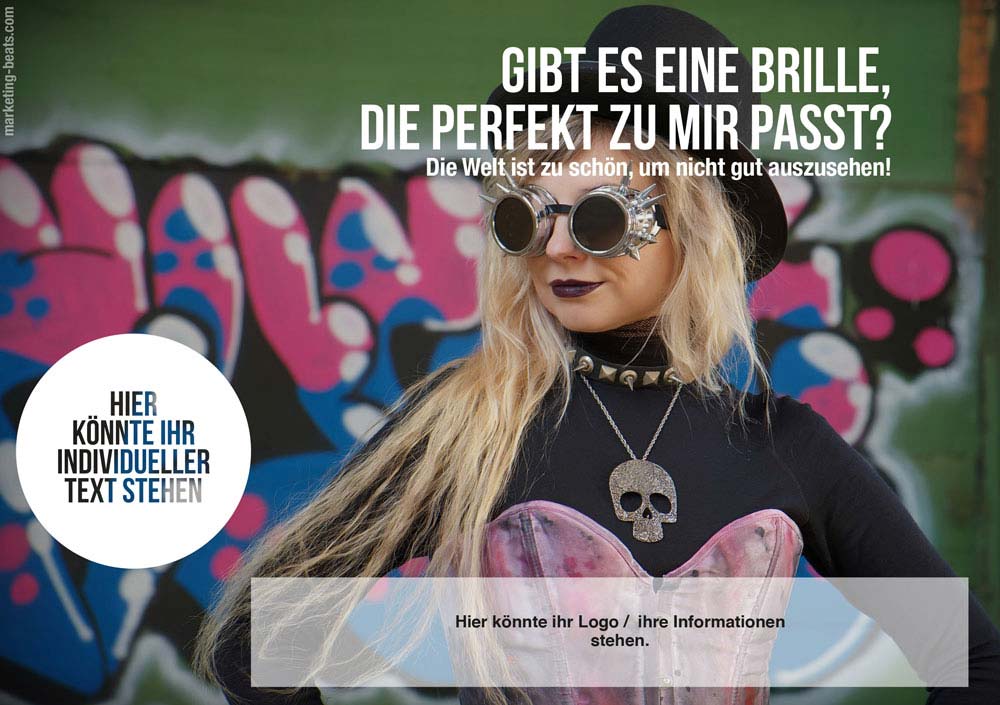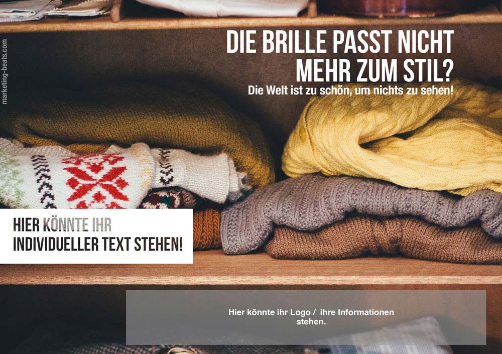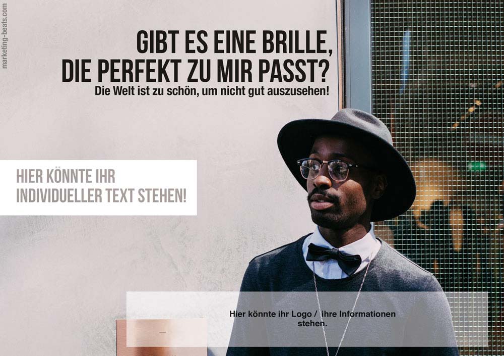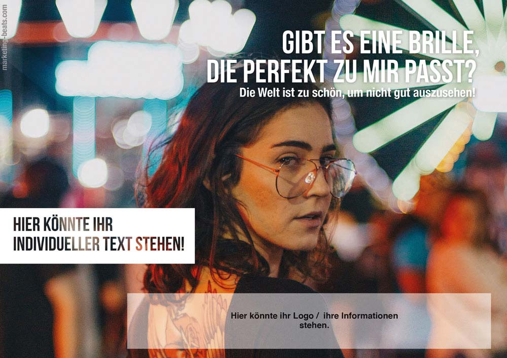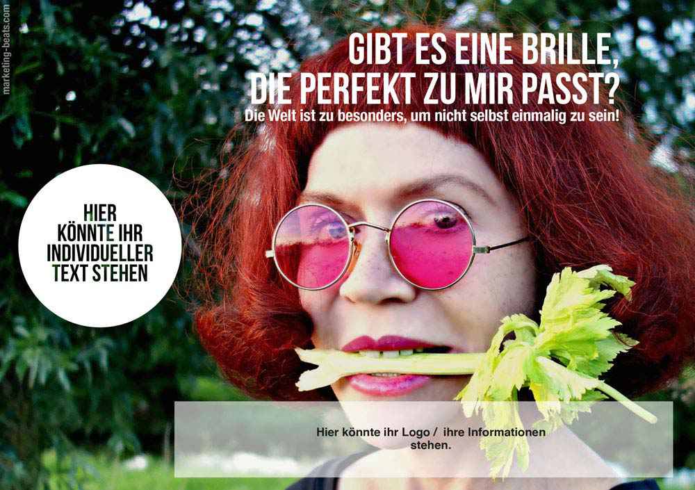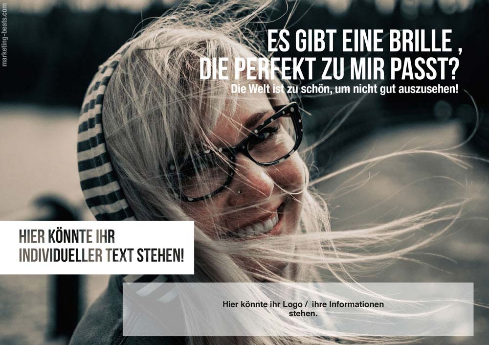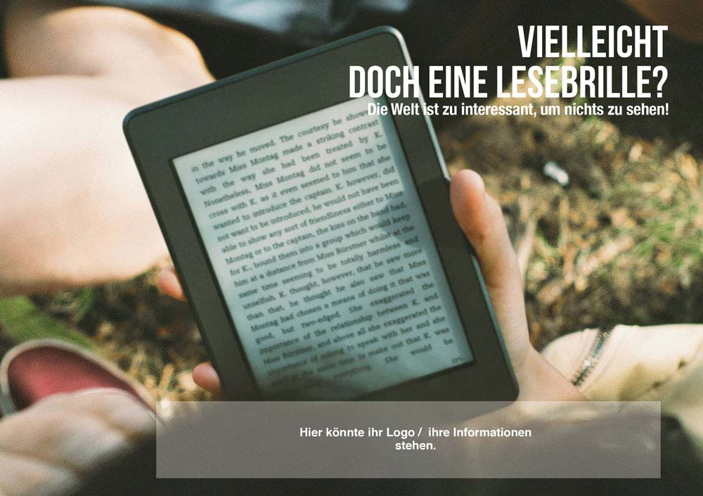 Für viele Zwecke bieten wir preisbewussten Kunden fertige, aufs CD individualisiert gestaltete Werbe-Kampagnen digital und als Print an. Egal ob es um das Werben um die erste Lesebrille geht, ein stillvoller Wechsel zur neuen Brille oder eine Hausmesse ansteht.