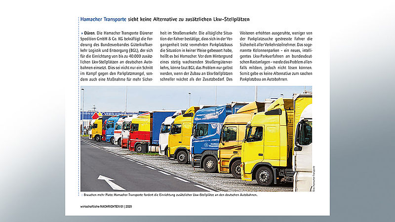 Hamacher Transporte advocates a higher level of traffic safety through more truck parking spaces. The reasons for this are explained in the short text in the January edition of the Wirtschaftliche …