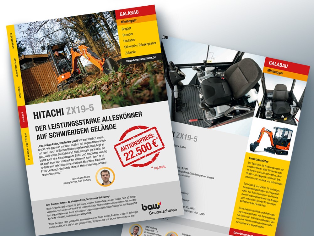 For BAW Baumaschinen Vertrieb GmbH we have successfully completed the first job. The task was the conception of new product documentation in print format. The first flyer with sales information and …