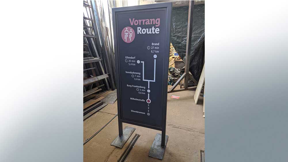 16 großformatige Infotafeln auf den neuen Rad-Vorrang-Routen aus Aachen-City nach Eilendorf und zum Campus Melaten dienen zukünftig der Orientierung. Längs der 11 km langen Wegstrecke aufgestellt, …