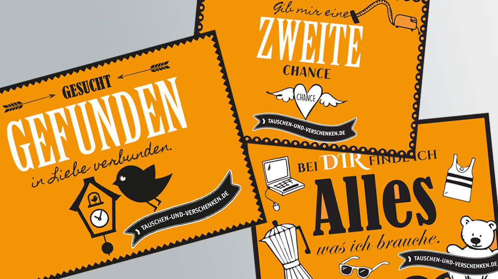 As part of a promotional campaign for the online marketplace tauschen-und-verschenken.de we have designed free postcards with various motifs.